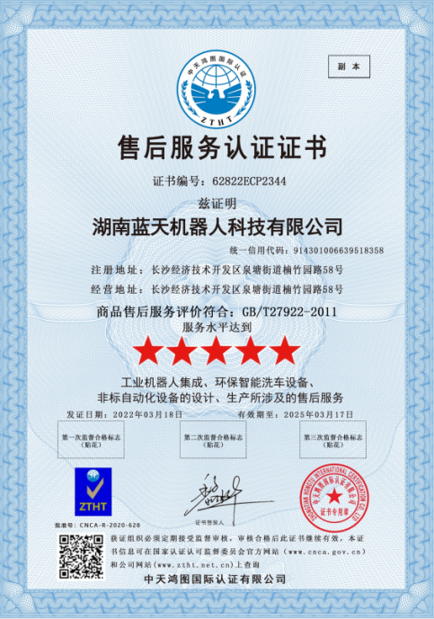 實(shí)力“五星”, 服務(wù)“五星”!湖南藍(lán)天機(jī)器人通過(guò)商品售后服務(wù)評(píng)價(jià)體系五星級(jí)認(rèn)證